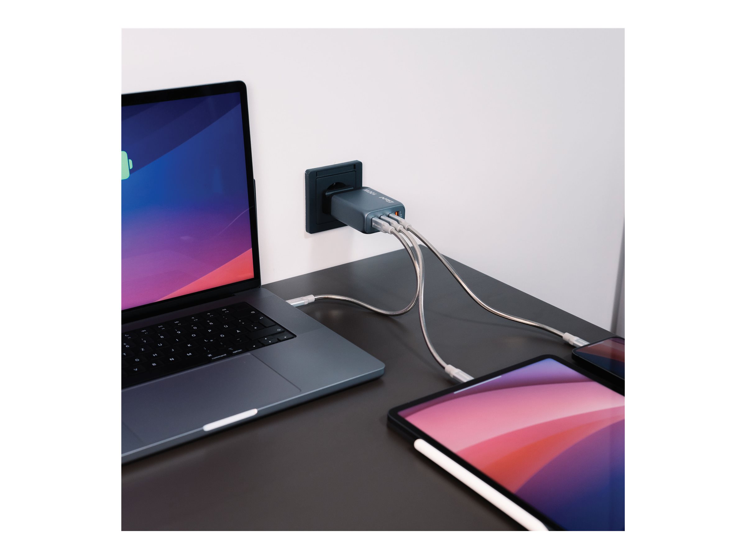 | Strømenhedsoplysninger | 2 x 24 pin USB-C with Power Delivery - 20 V - 100 W - 5 A<br>24 pin USB-C with Power Delivery - 20 V - 65 W - 5 A<br>4 pin USB Type A QC 3.0 - 20 V - 30 W - 5 A |
